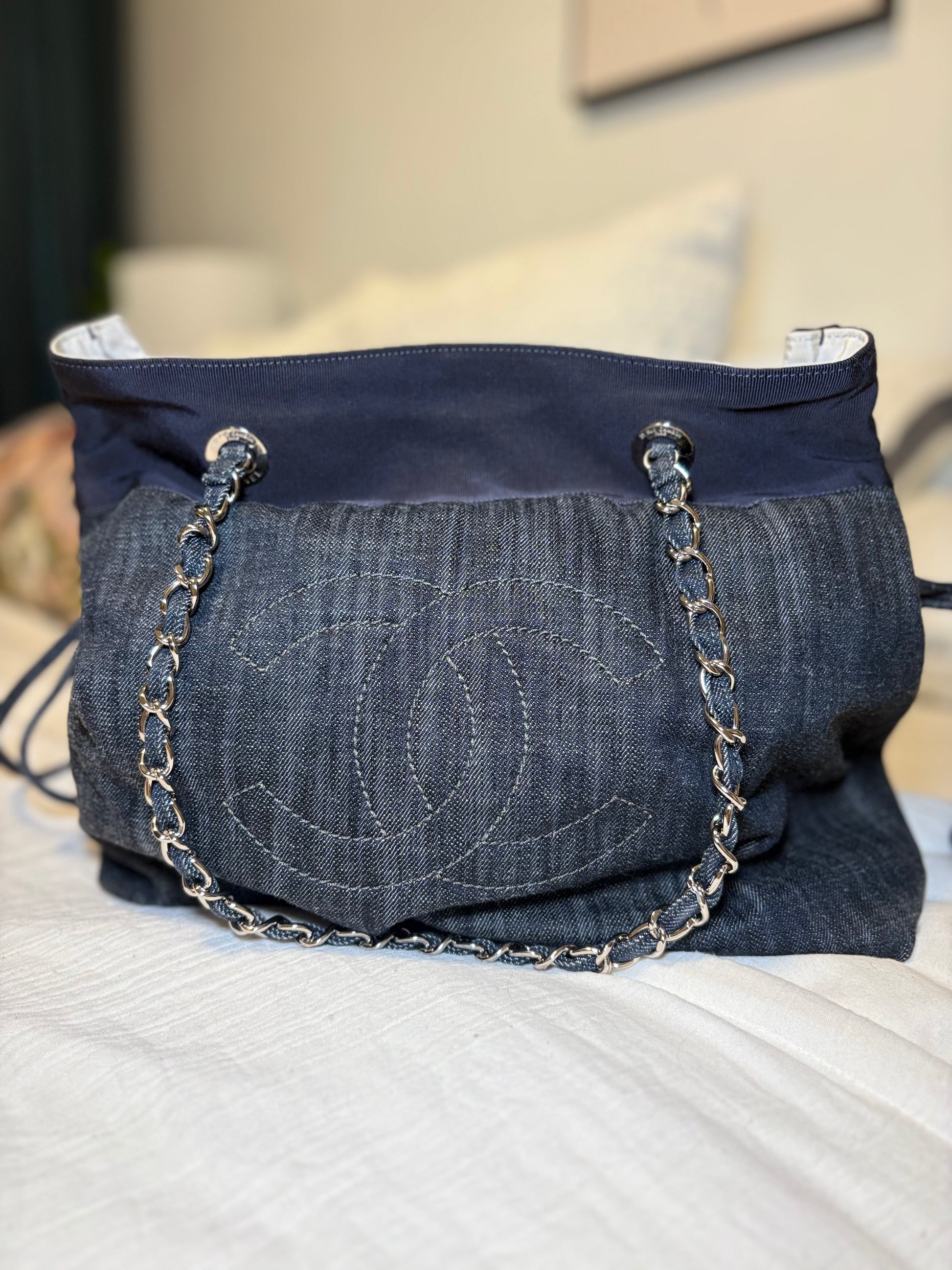 Condition: Excellent condition, no flaws to mention. Denim exterior is clean, interior is clean, no corner rips or markings. Chain is clean