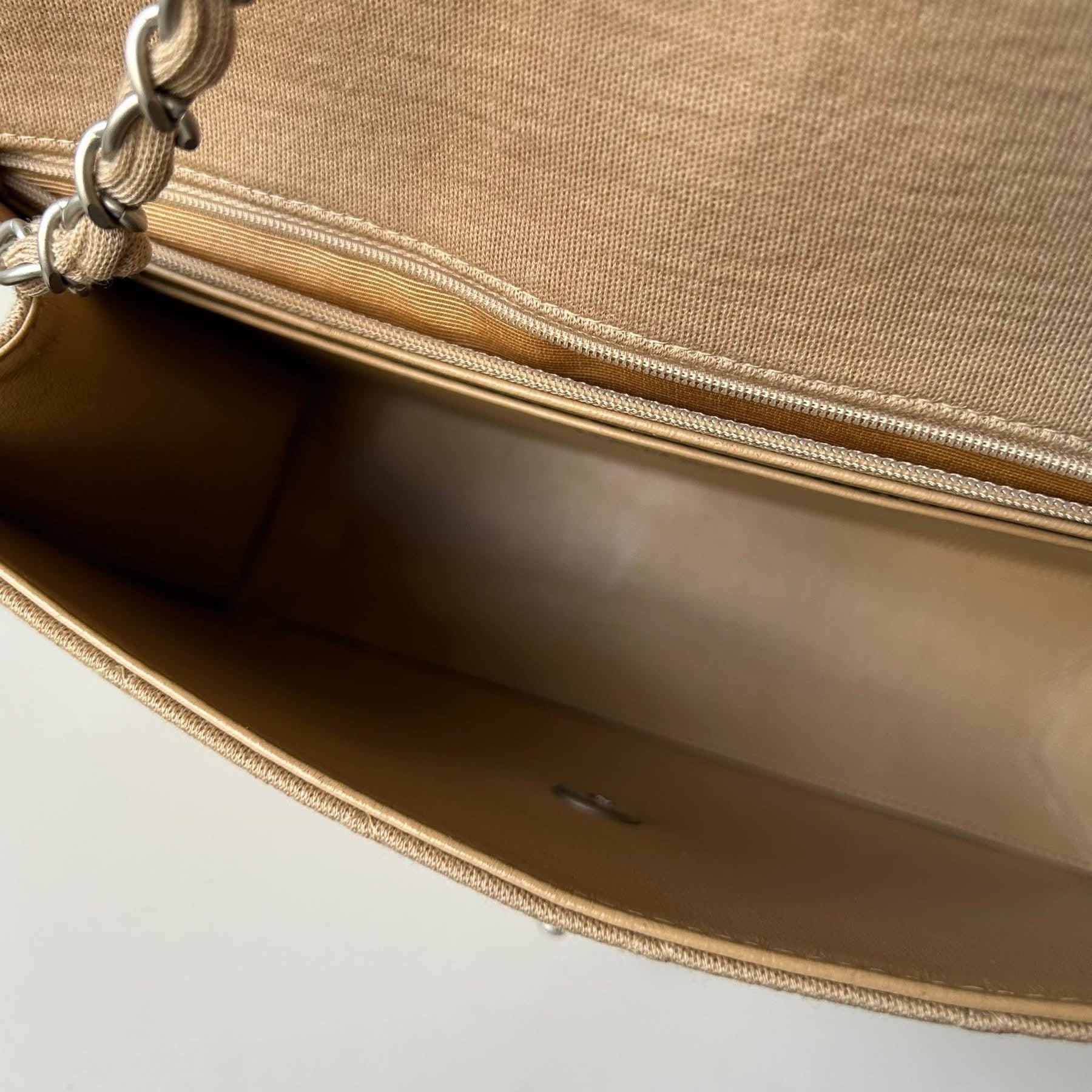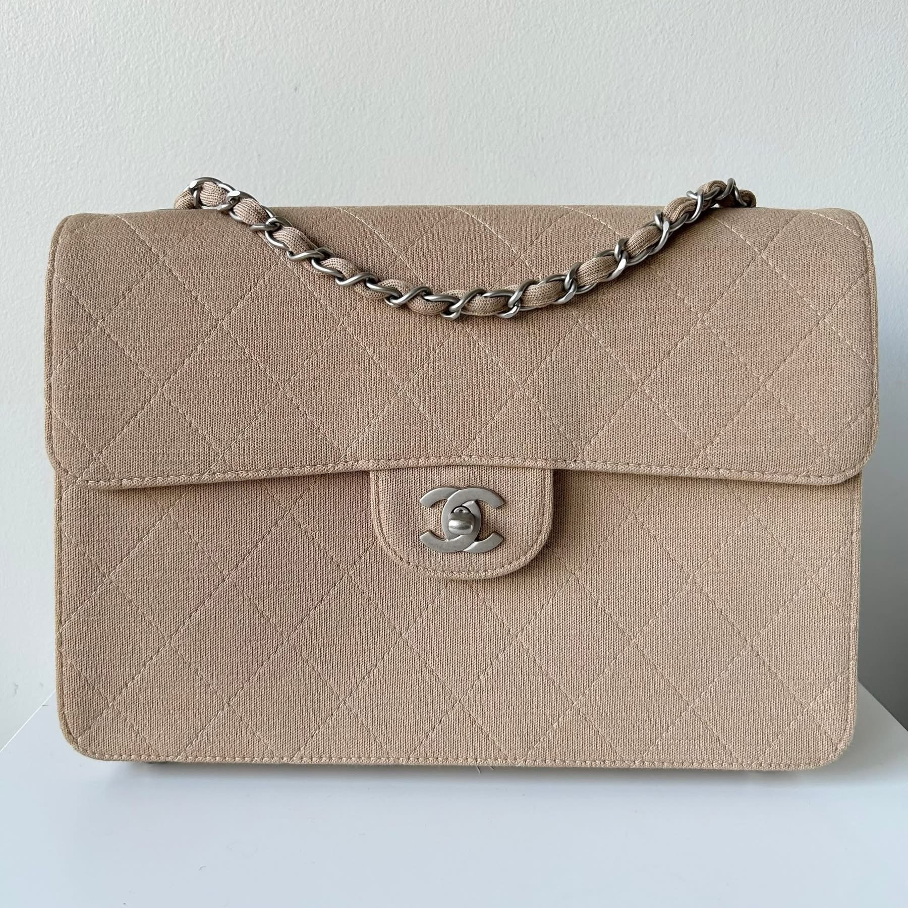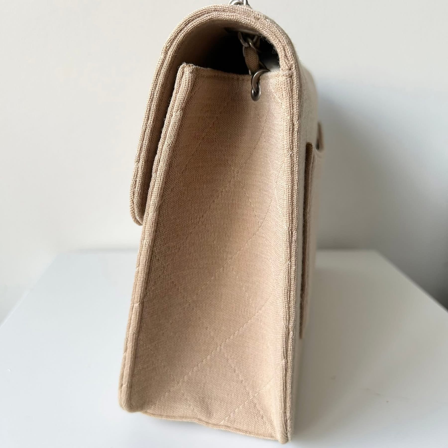 This stunning jersey flap is in impeccable condition overall! Featured with gorgeous butter nude fabric and matte silver hardware. A must for any season & occasion!